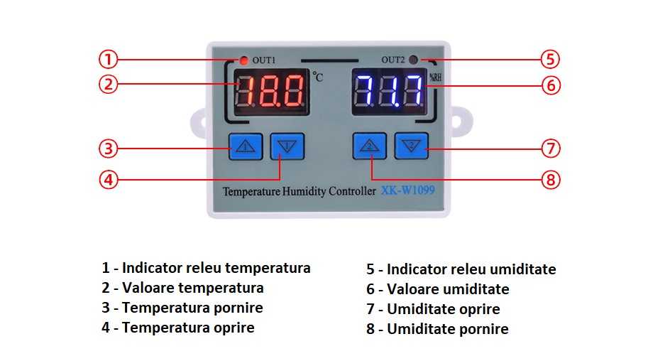 Termostat W1099 care permite controlul a două dispozitive simultan. Prezinta doi senzori, unul pentru temperatura si unul pentru umiditate, care pot controla doua iesiri individuale. Este alimentat de o sursă de 220 VAC AC. Ieșirile prezintă direct tensiunea de alimentare atunci când termostatul activează canalul respectiv. Atât temperatura, cât și umiditatea pot fi calibrate. Termostatul poate funcționa în regim de încălzire sau răcire, în funcție de echipamentul conectat la acesta, asta înseamnă că temperatura de pornire poate fi setată mai mică sau mai mare decât temperatura de oprire. Același lucru este valabil și pentru umiditate, adică se poate conecta un echipament de umidificare sau dezumidificare. Afișajul arată temperatura și umiditatea pe afișaje separate care au culori diferite (temperatura roșie, umiditatea albastră).